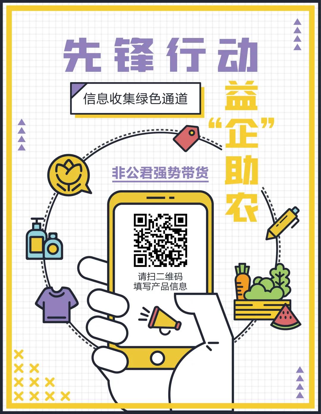 為征集滯銷求助信息,對(duì)接更多滯銷產(chǎn)品,請(qǐng)全國(guó)各級(jí)兩新組織以企業(yè)或政府部門為單位,掃描下圖海報(bào)中的二維碼,填寫相關(guān)信息報(bào)名,我們將通過(guò)非公君全國(guó)平臺(tái),一起幫助大家渡過(guò)難關(guān)!