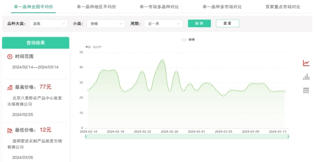 2024年2月14日至3月14日期間全國農(nóng)產(chǎn)品批發(fā)市場香椿平均價格。截圖自全國農(nóng)產(chǎn)品批發(fā)市場價格信息系統(tǒng)