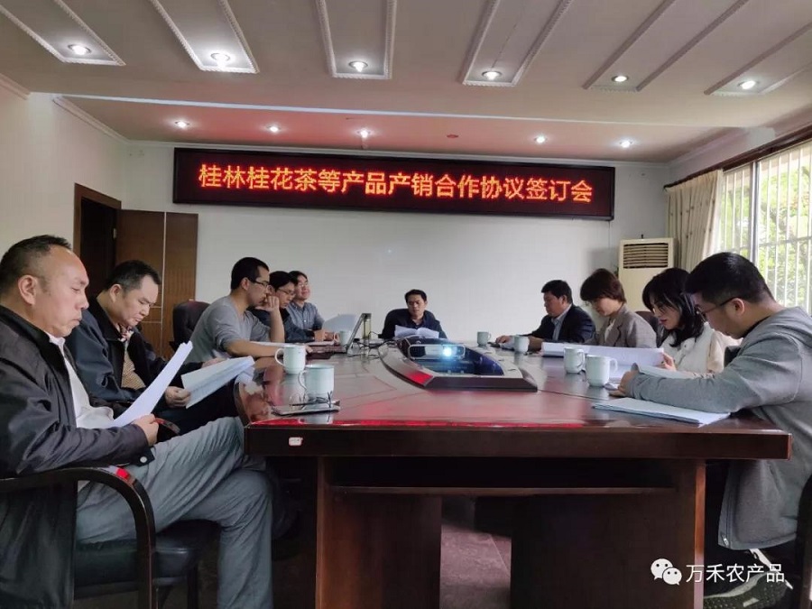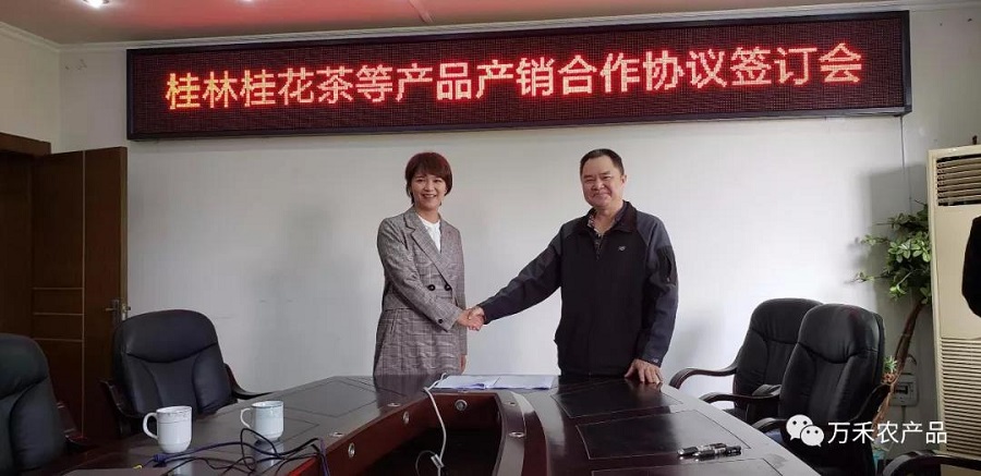 3月29日下午,萬(wàn)禾農(nóng)產(chǎn)品有限公司與桂林茶葉科學(xué)研究所簽訂了桂林桂花茶等產(chǎn)品產(chǎn)銷(xiāo)合作協(xié)議。桂林市茶葉科學(xué)研究所所長(zhǎng)韋靜鋒、桂林萬(wàn)禾農(nóng)產(chǎn)品有限公司黨總支書(shū)記、總經(jīng)理崔萌佳、董事長(zhǎng)陶辛有等人出席簽約儀式。