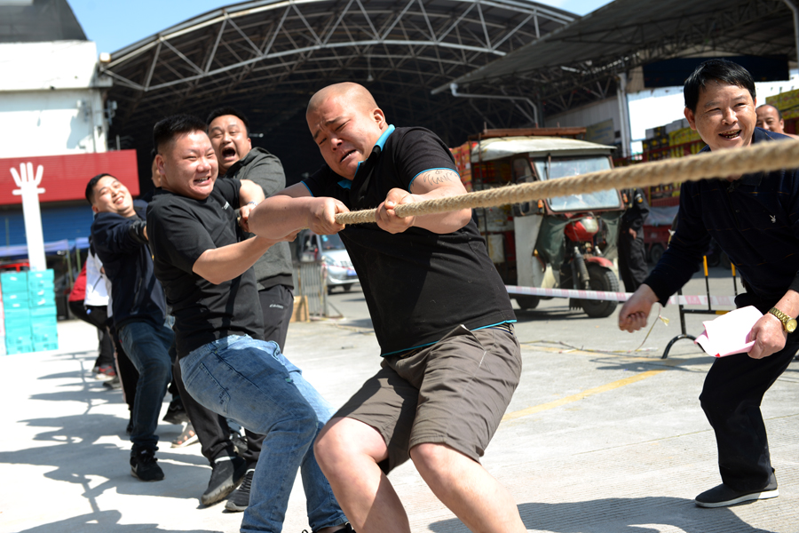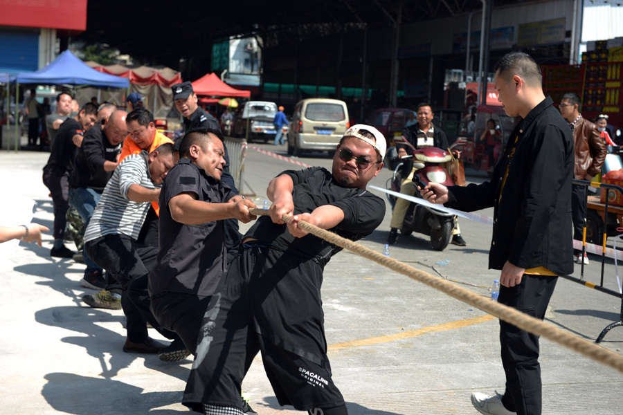 參賽隊(duì)員們排好隊(duì)列、擺正姿勢,雙手緊握繩子......隨著一聲哨響,一場拔河比賽緊張開鑼,大繩被拉得緊緊繃繃,各組隊(duì)員們全力以赴、咬牙堅(jiān)持,“加油”的聲音響徹市場,一旁的啦啦隊(duì)亦是全情投入,感受著運(yùn)動(dòng)帶來的快樂。