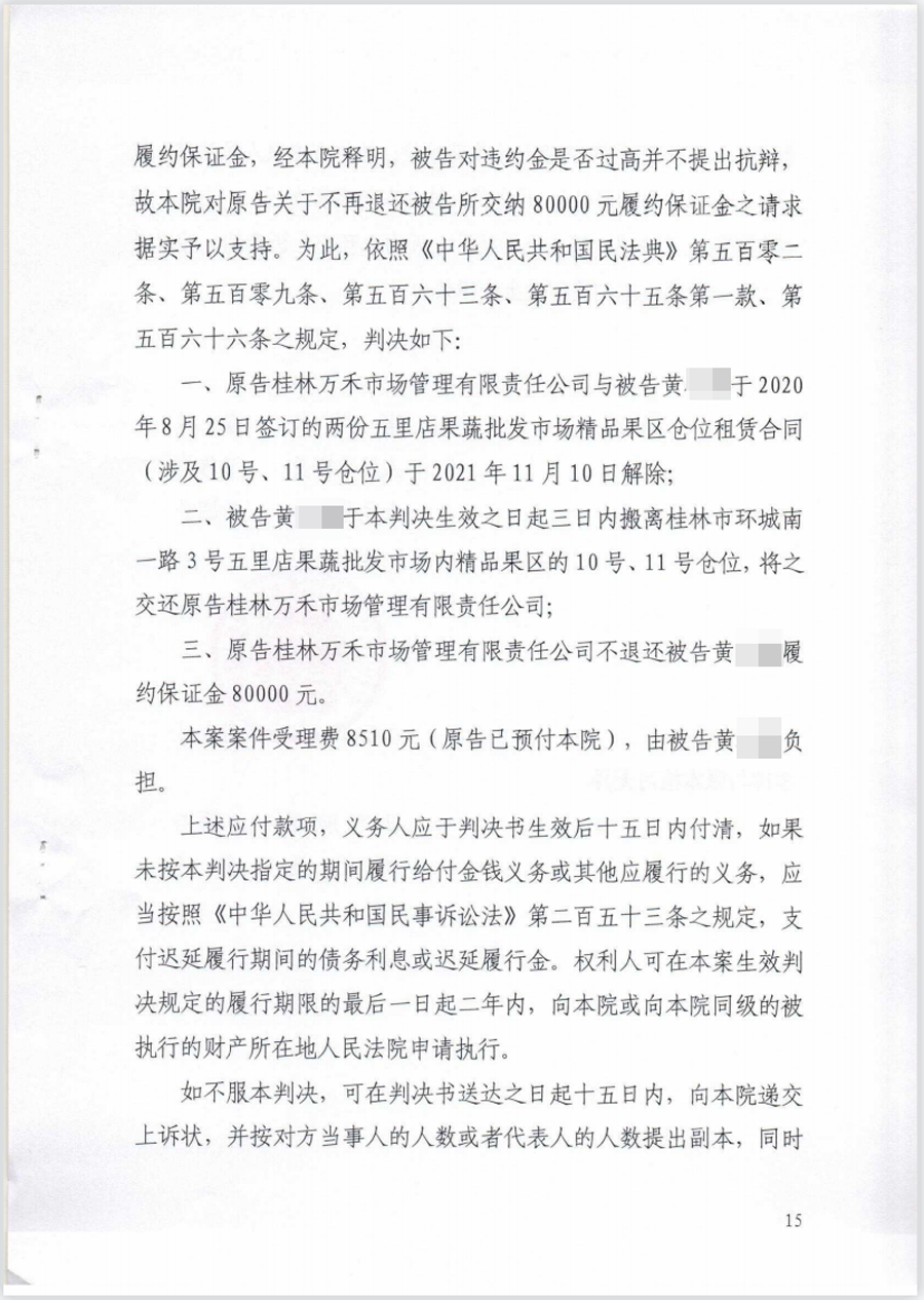 2021年12月13日,桂林萬禾市場管理有限責任公司(以下簡稱:市場公司)與桂林五里店果蔬批發(fā)市場原商戶黃某某租賃合同糾紛案件迎來法院一審判決。