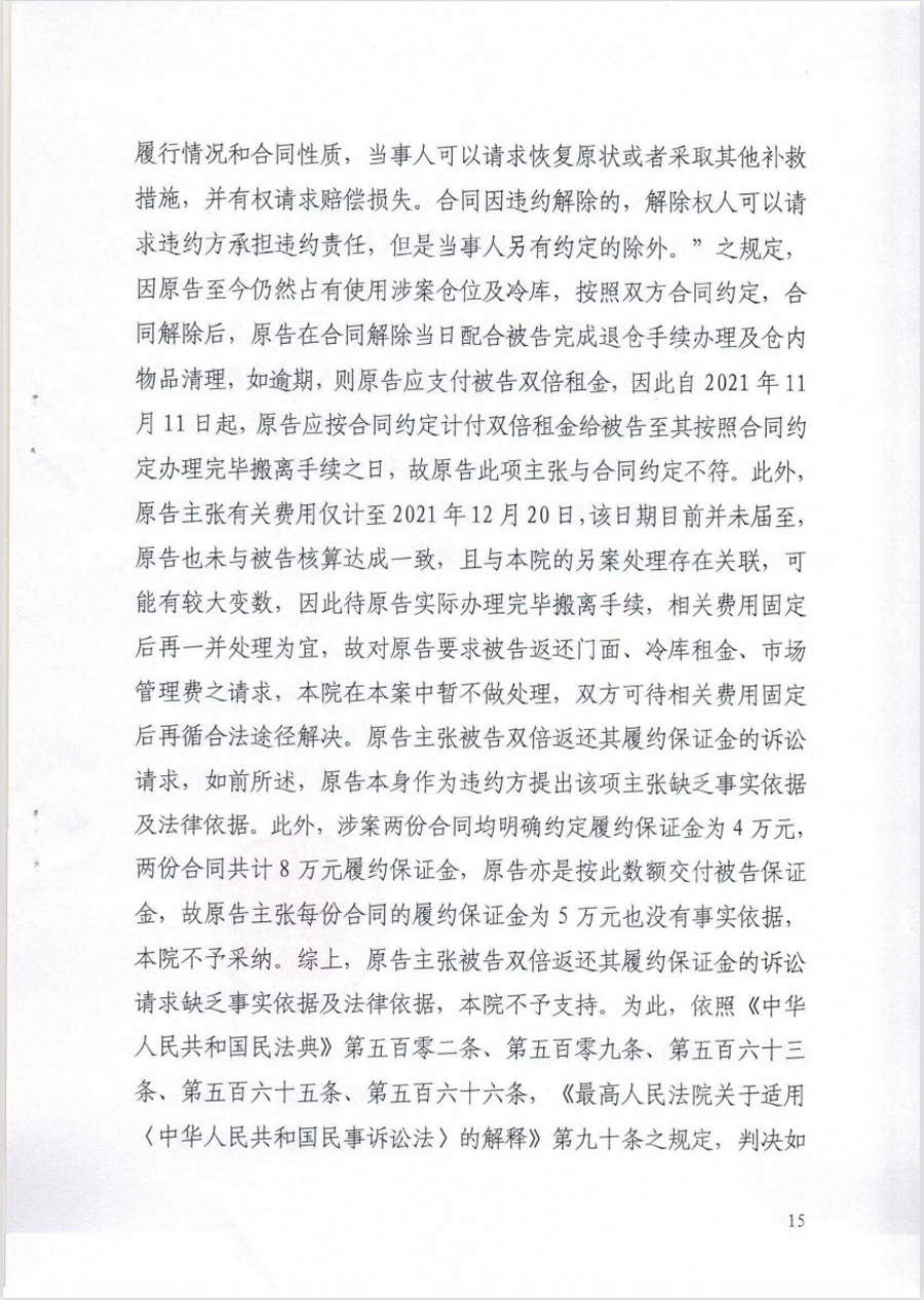一、原告桂林萬禾市場管理有限責任公司與被告黃某某于2020年8月25日簽訂的兩份五里店果蔬批發(fā)市場精品果區(qū)倉位租賃合同(涉及10號、11號倉位)于2021年11月10日解除。